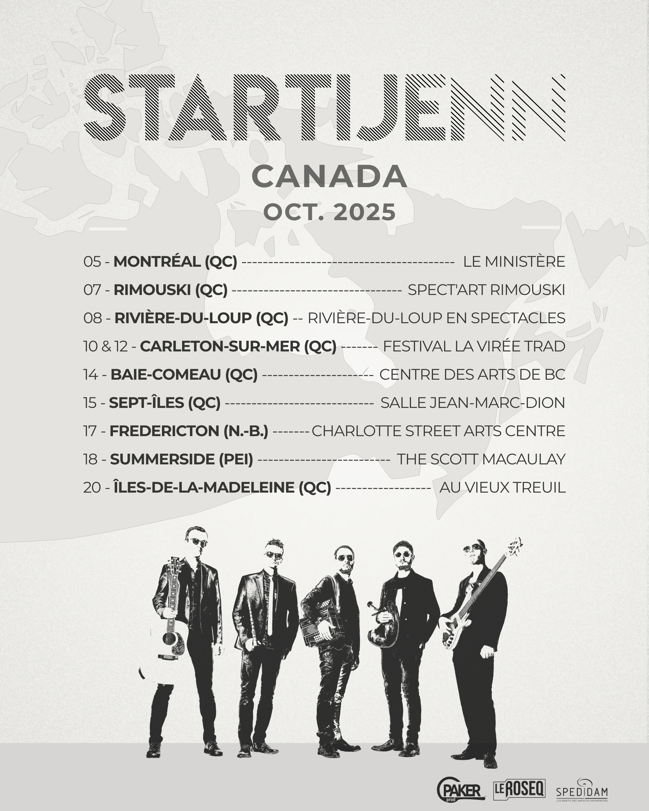 Après avoir fait vibrer les plus grandes scènes bretonnes cet été — du Festival Interceltique de Lorient au Festival de Cornouaille, sans oublier un passage remarqué sur la grande scène du Festival du Bout du Monde à Crozon — le groupe Startijenn poursuit son incroyable tournée 2025 au-delà des frontières. Déjà passés par l’Allemagne, la Suisse, et l’Espagne, les six musiciens s’envolent désormais vers l’Amérique du Nord pour une tournée exceptionnelle de 10 concerts au Canada.
